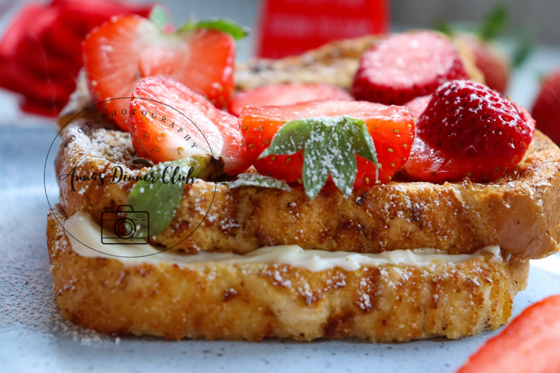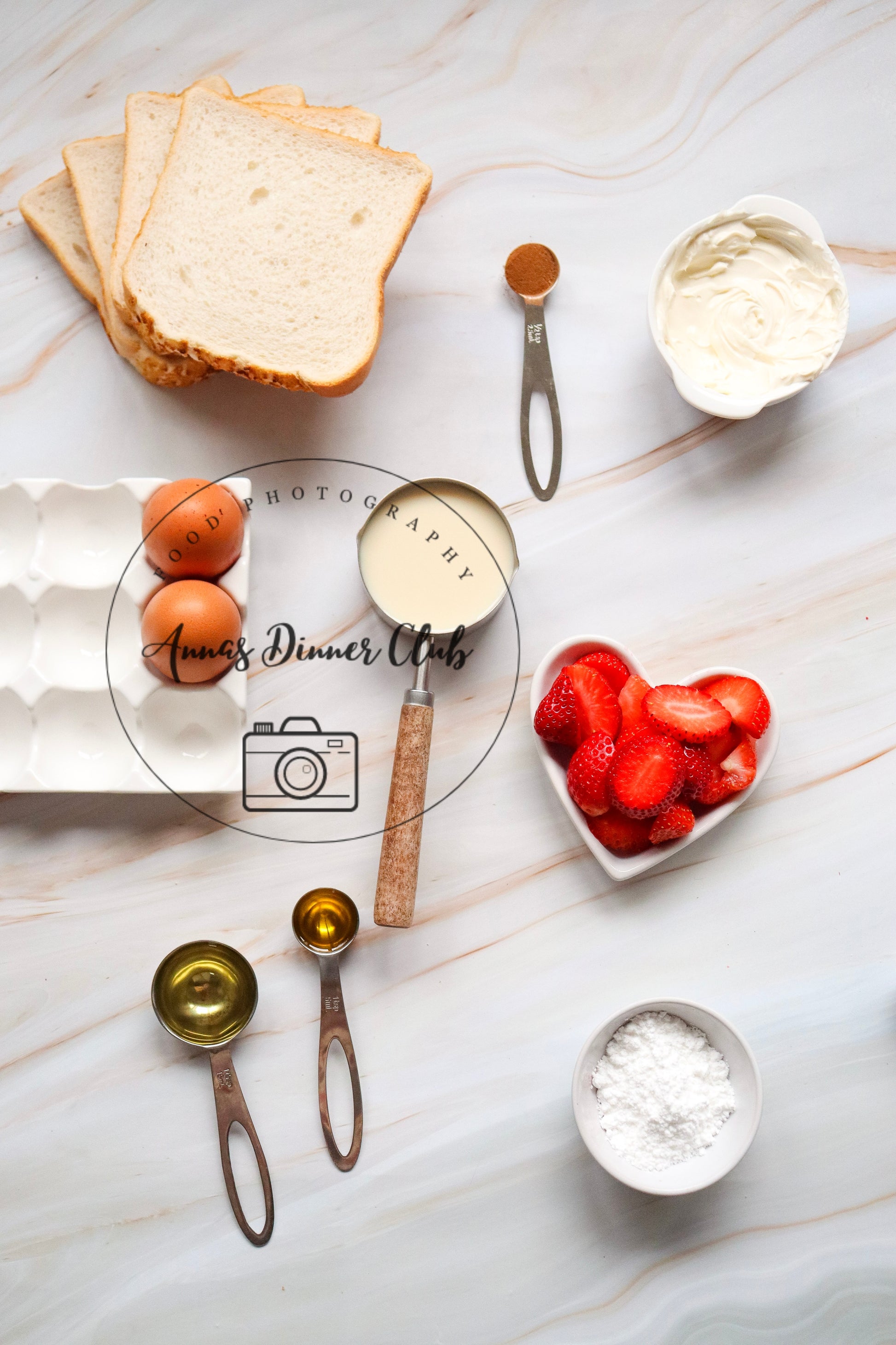 Ingredients: bread, strawberries, cream cheese, vanilla extract, olive oil, eggs, powdered sugar