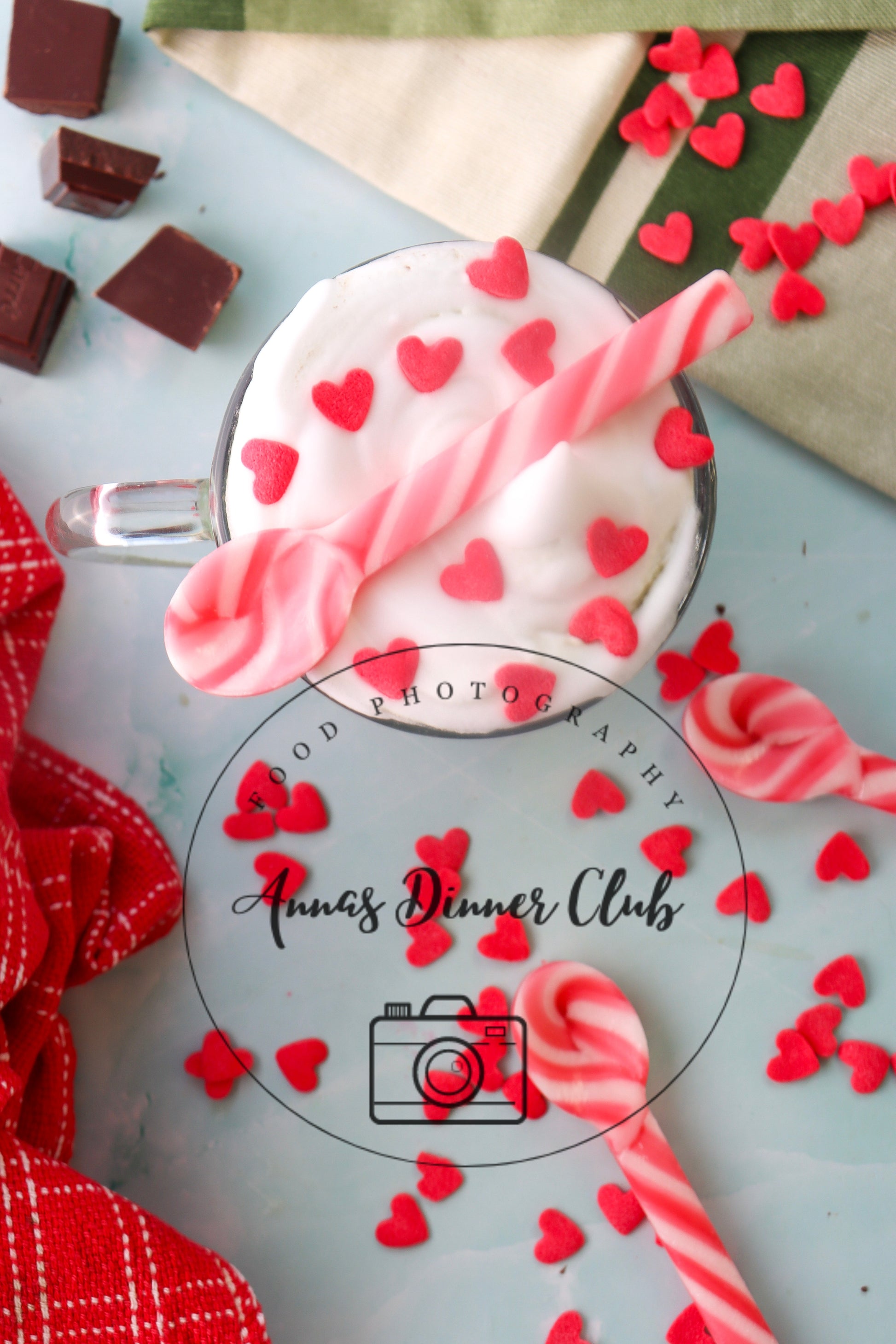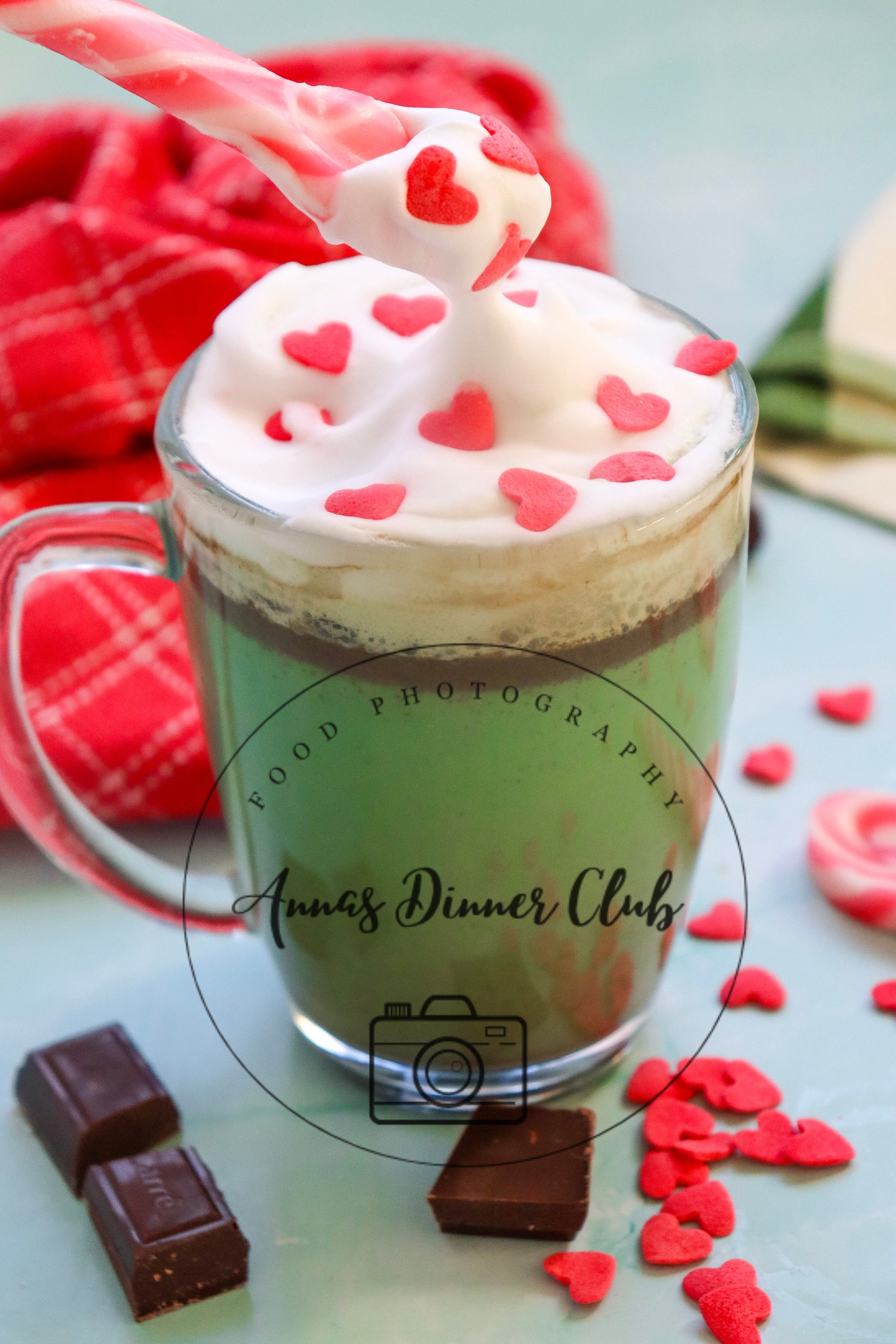 Ingredients: dark cooking chocolate, milk ( any kind), granulated sugar, green food colouring, heart shaped sprinkles, whipped cream, vanilla extract.