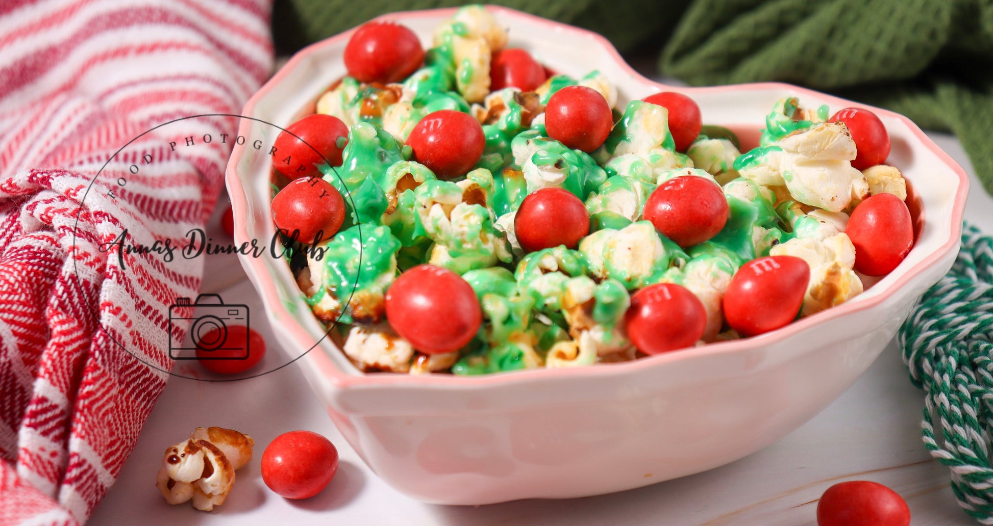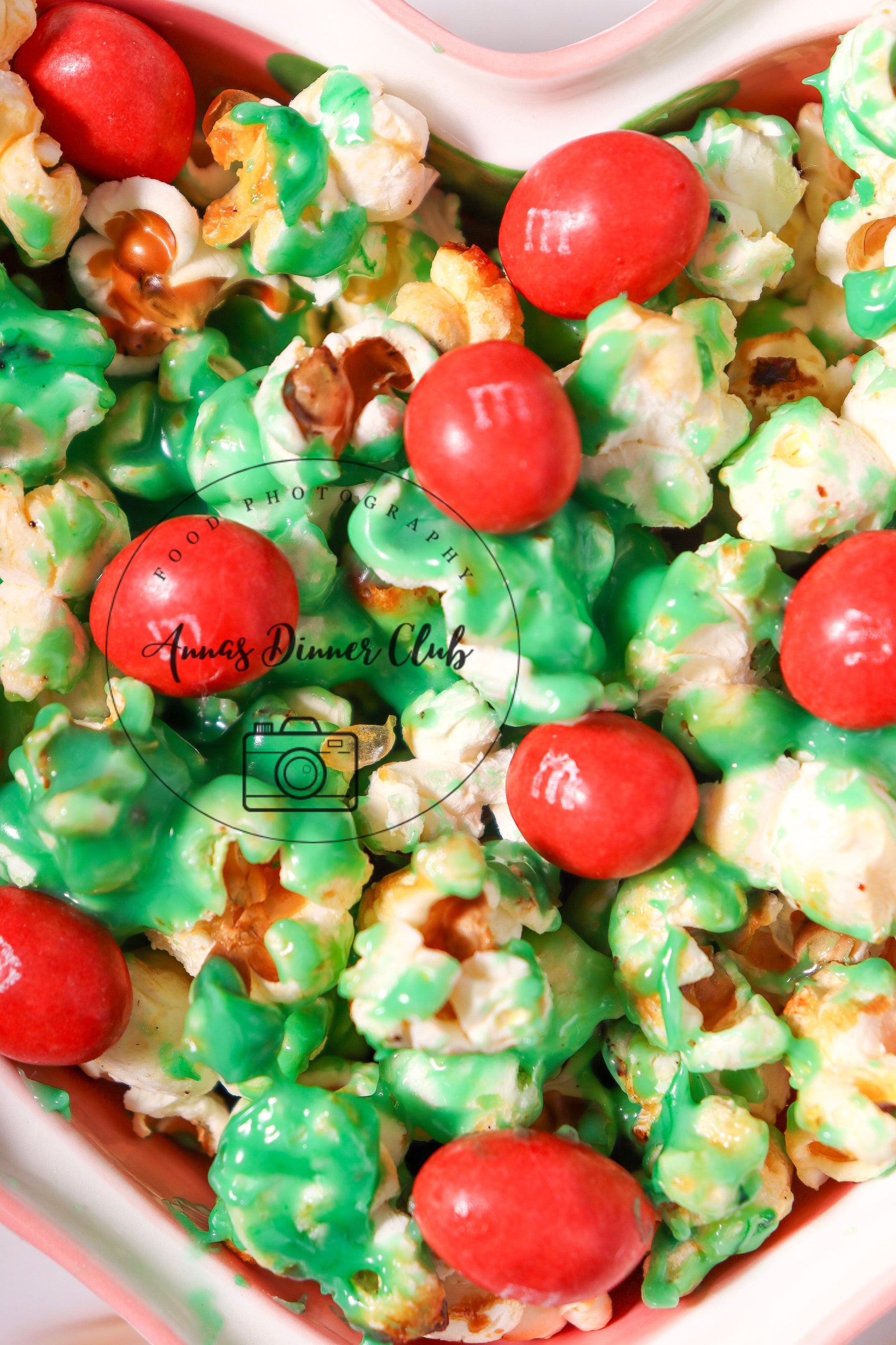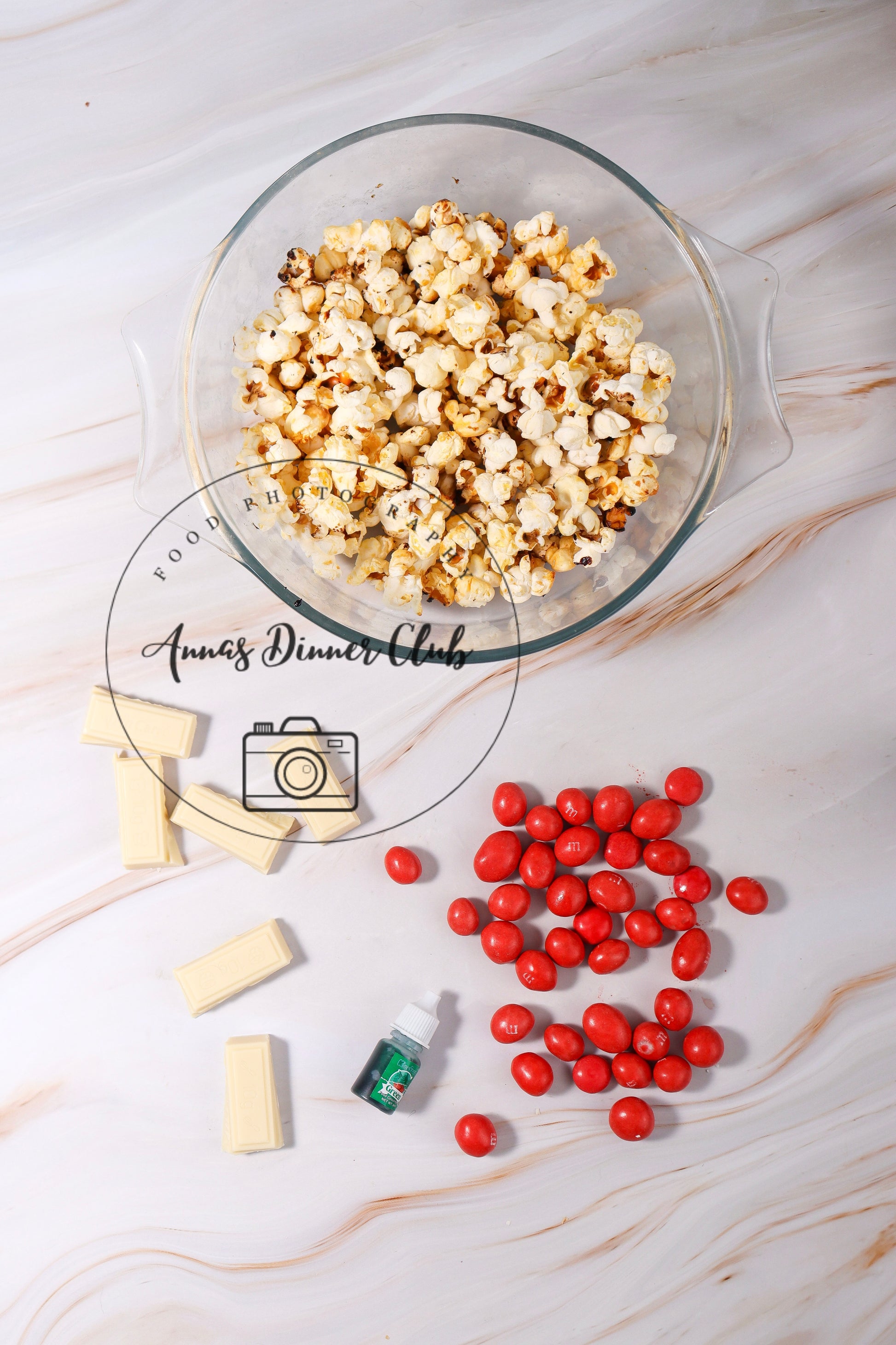 Ingredients: popcorn, red M&ms, green food coloring, white chocolate