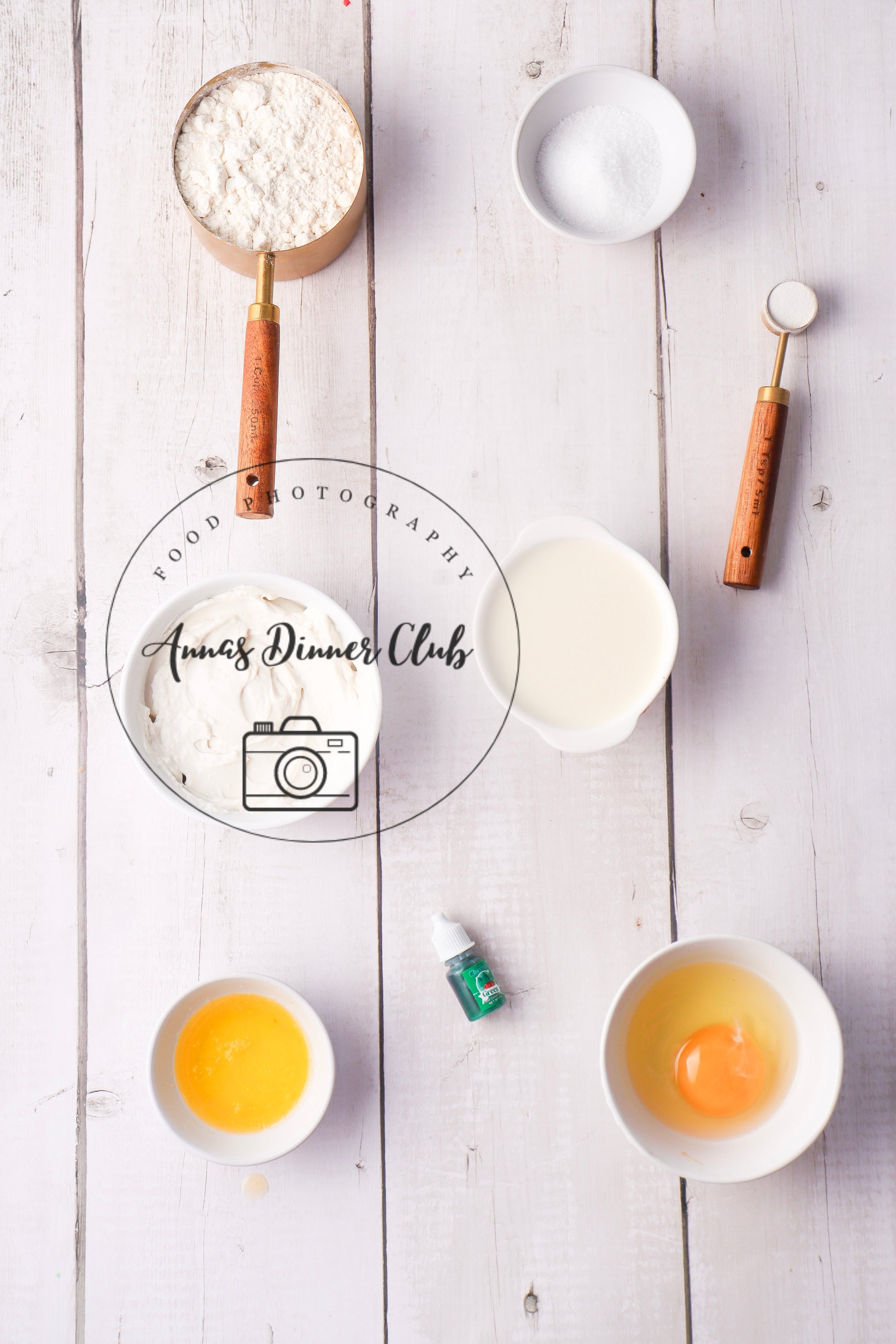 Ingredients: self raising flour, baking powder, granulated sugar, milk, egg. green food colouring, greek yogurt, butter, heart shaped sprinkles.