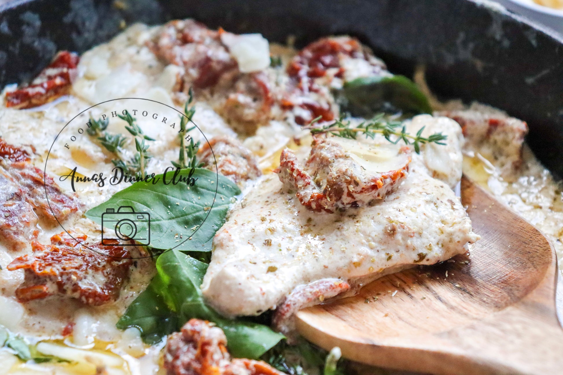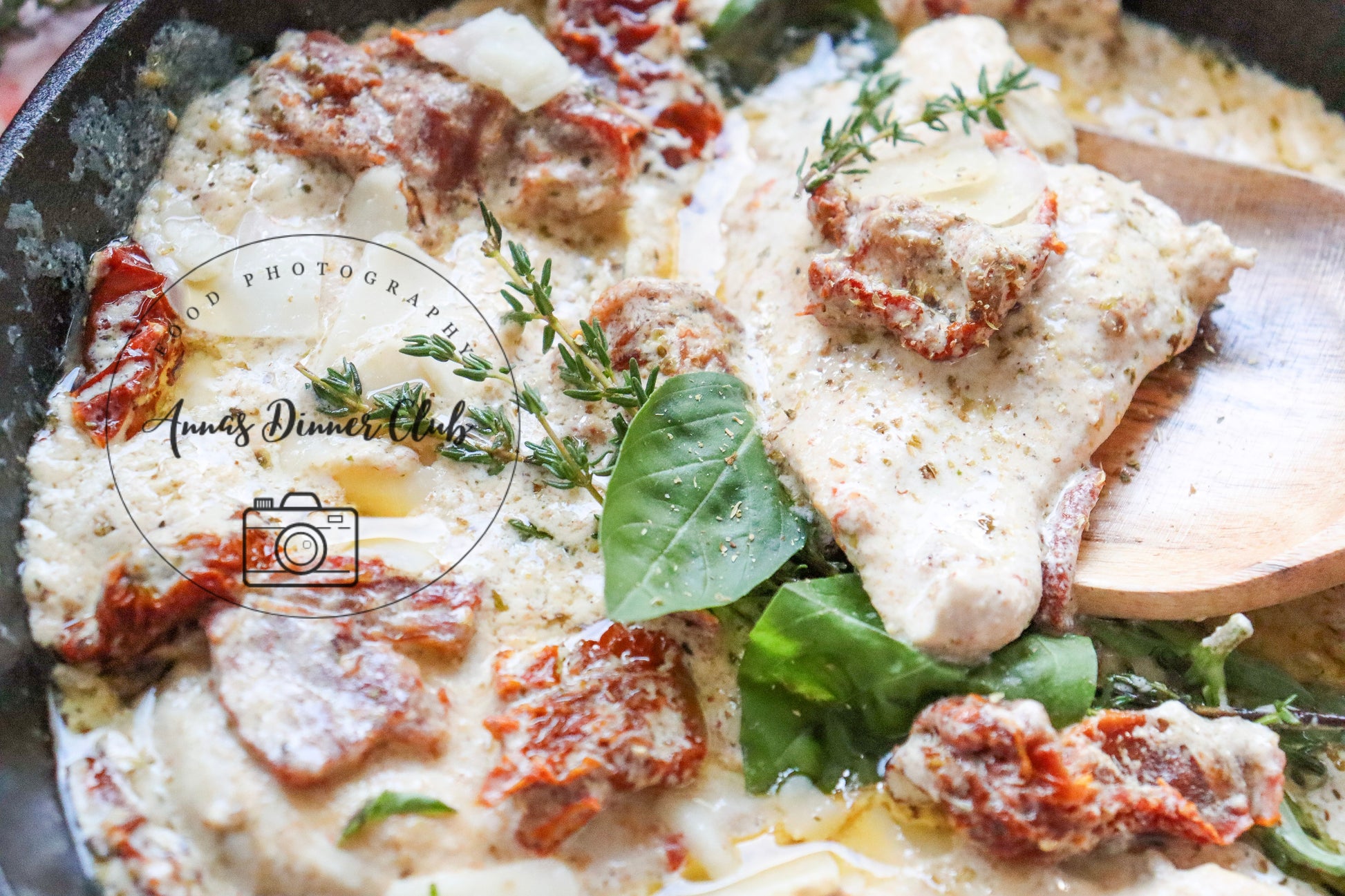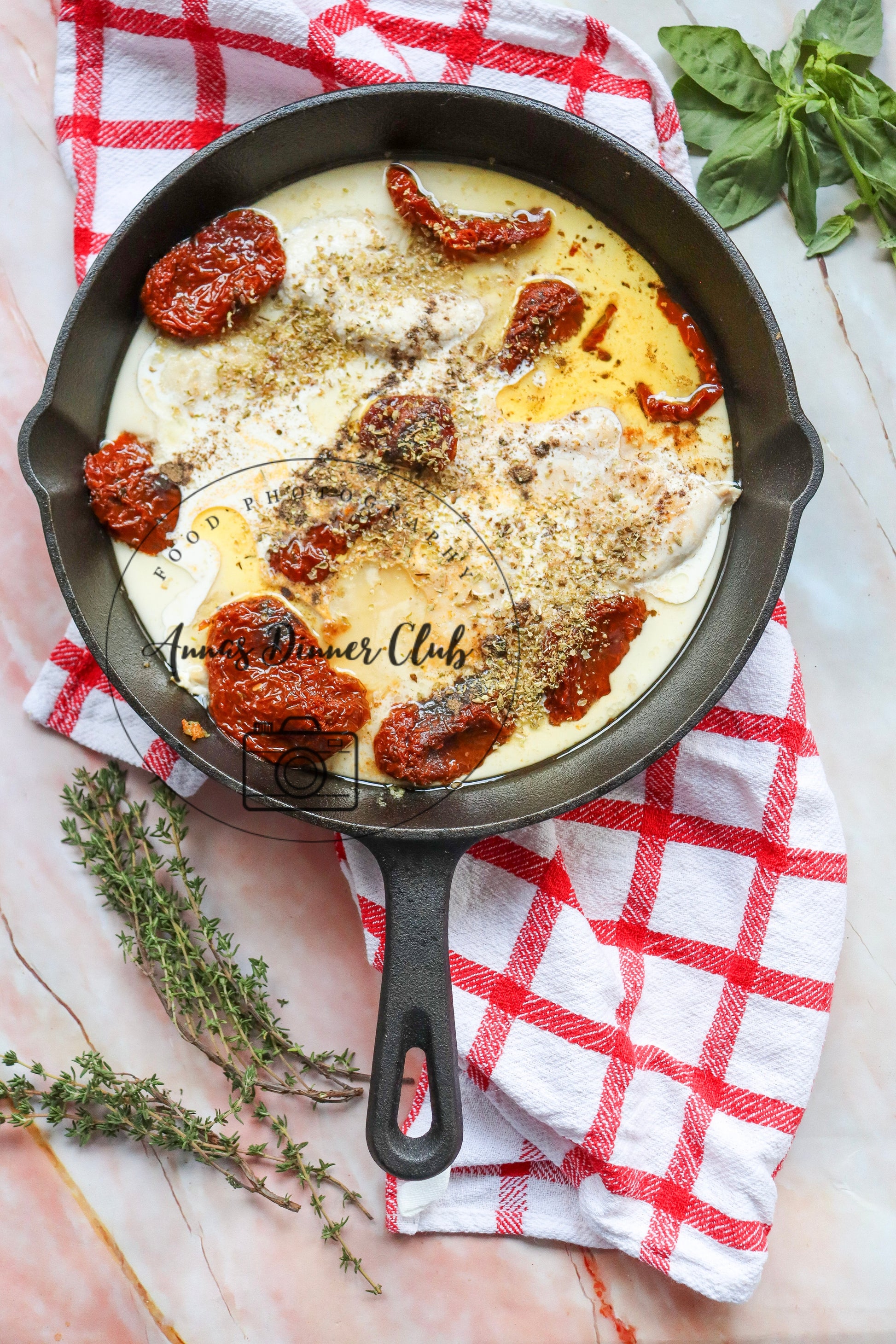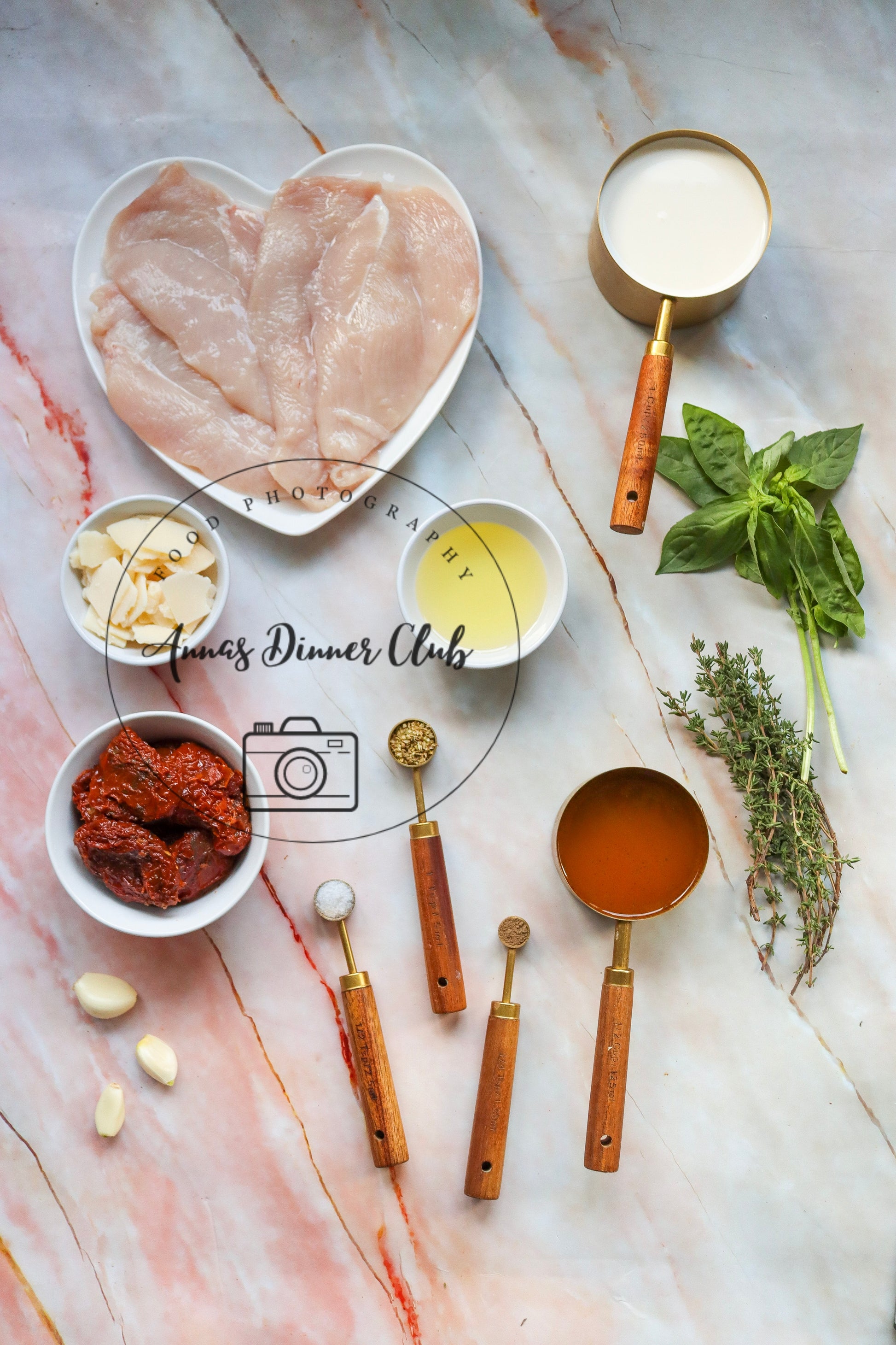 Ingredients: chicken breast, garlic, heavy cream, chicken broth, salt, pepper, oregano, fresh basil, thyme.