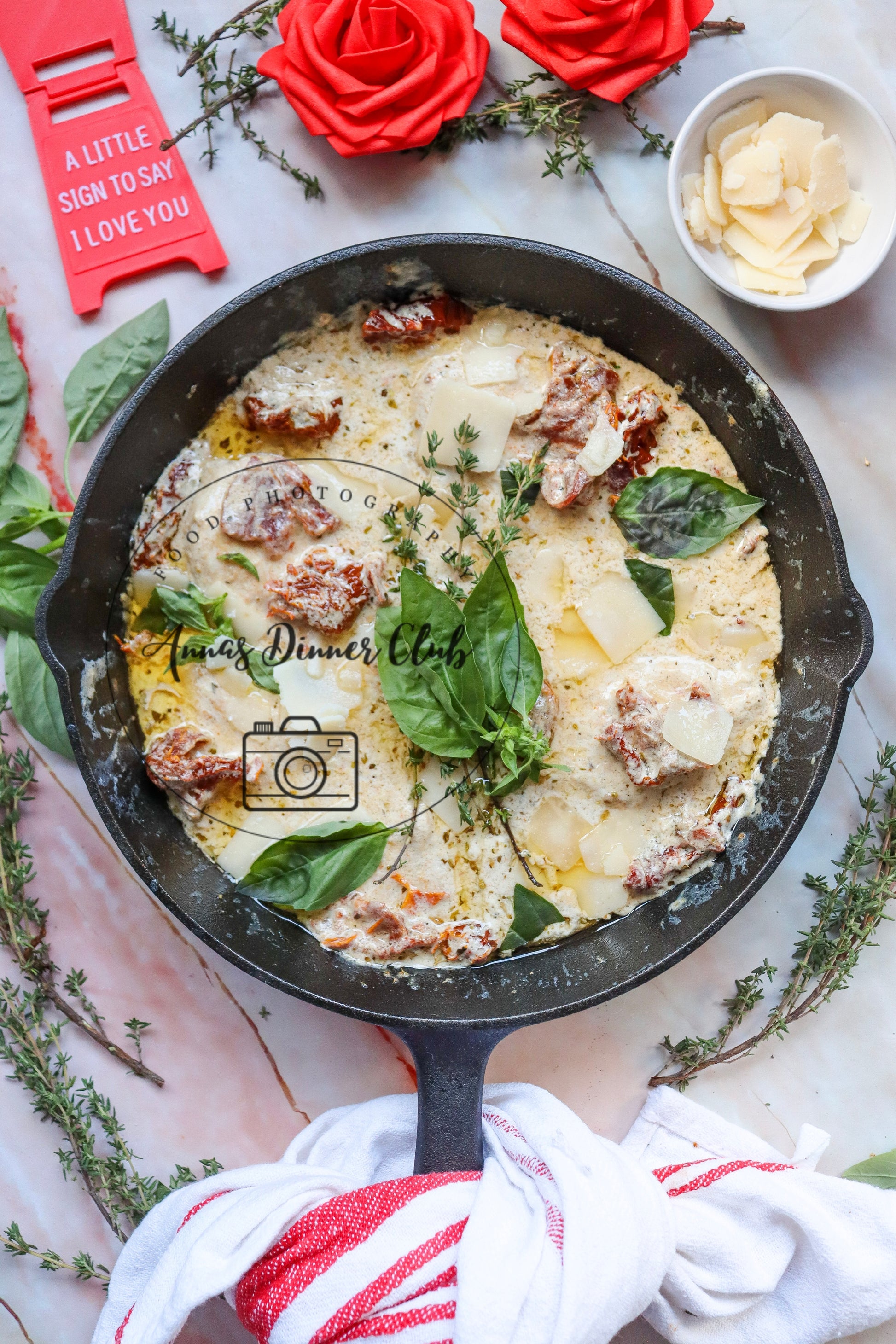 The dish is elevated with the addition of Parmesan cheese and fresh basil, creating a delightful balance of flavors that is perfect for a romantic dinner or a comforting family meal. Its quick cooking time makes it an ideal choice for weeknight dinners, served typically with pasta, garlic bread, or a fresh salad.