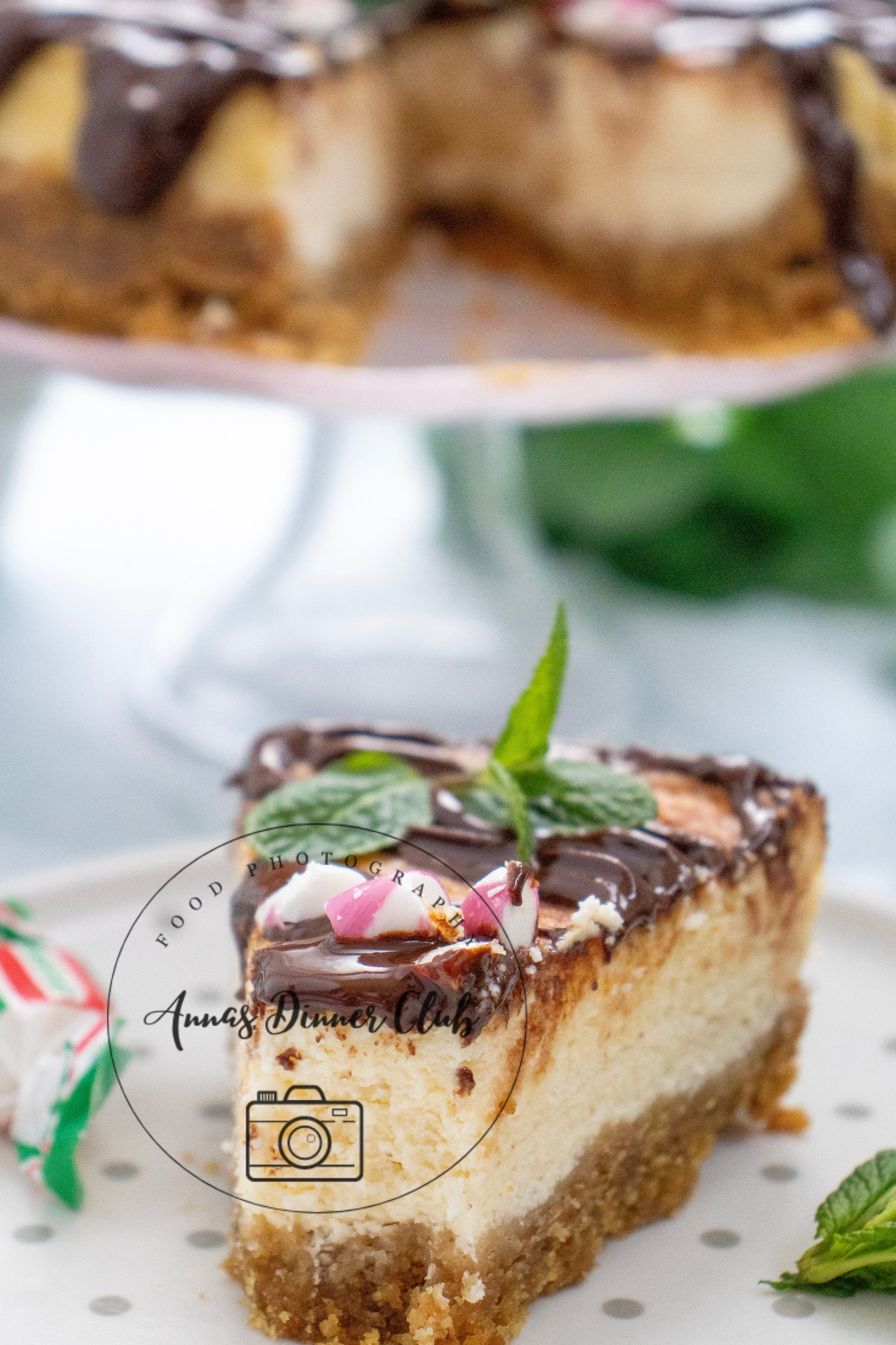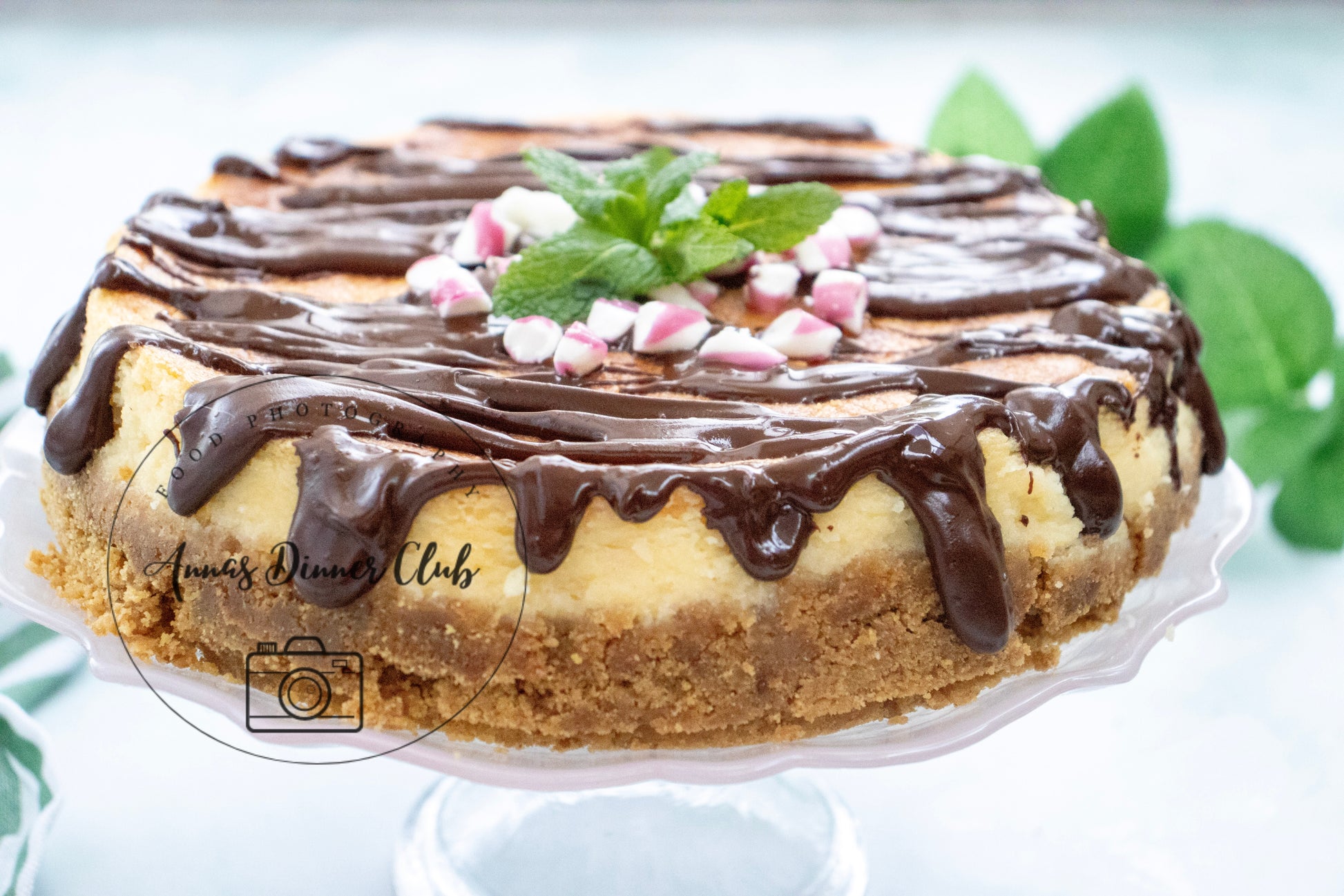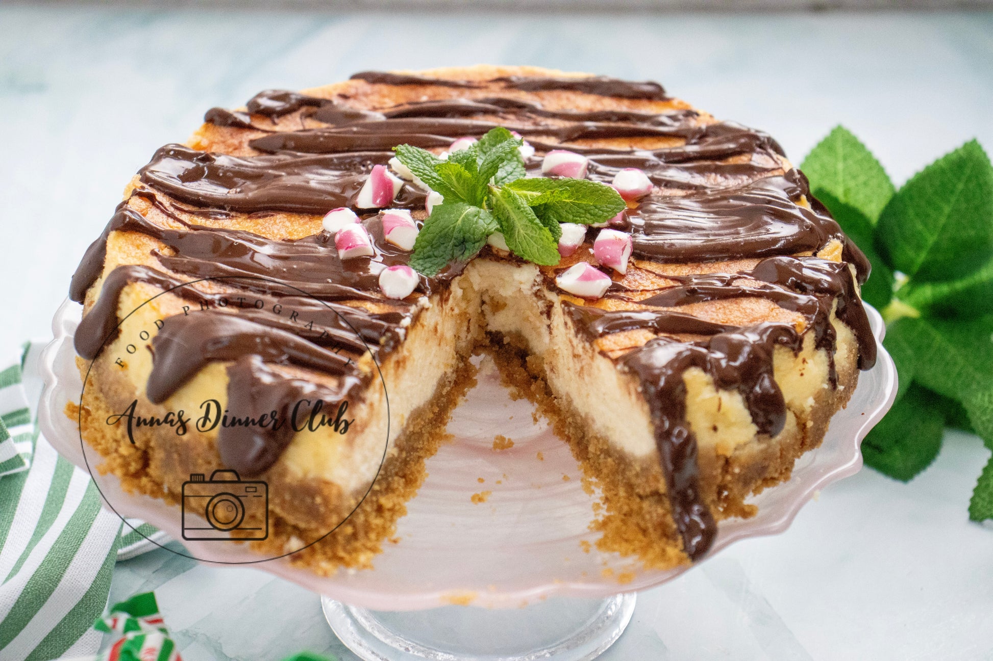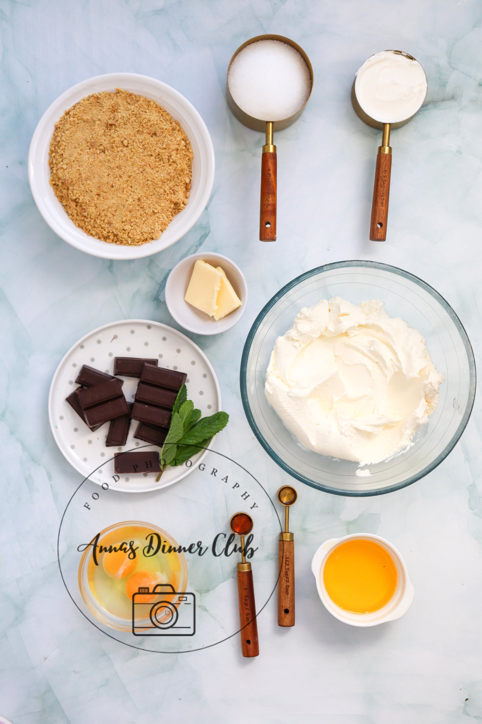 Ingredients: graham cracker crumbs, butter, cream cheese, vanilla extract, eggs, sour cream, peppermint extract, dark chocolate, granulated sugar, mint leaves and peppermint candies ( optional)