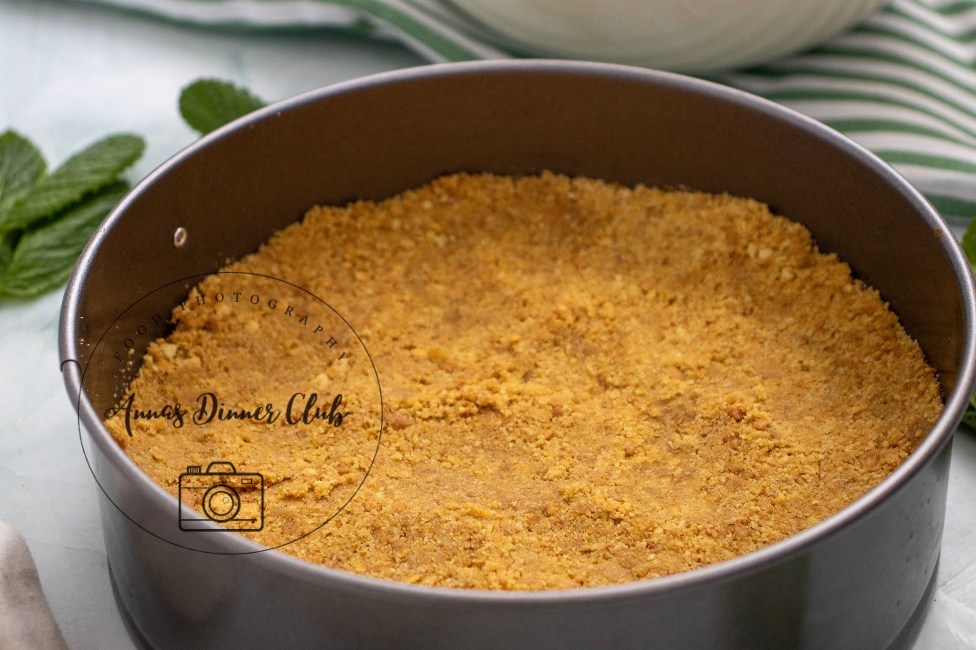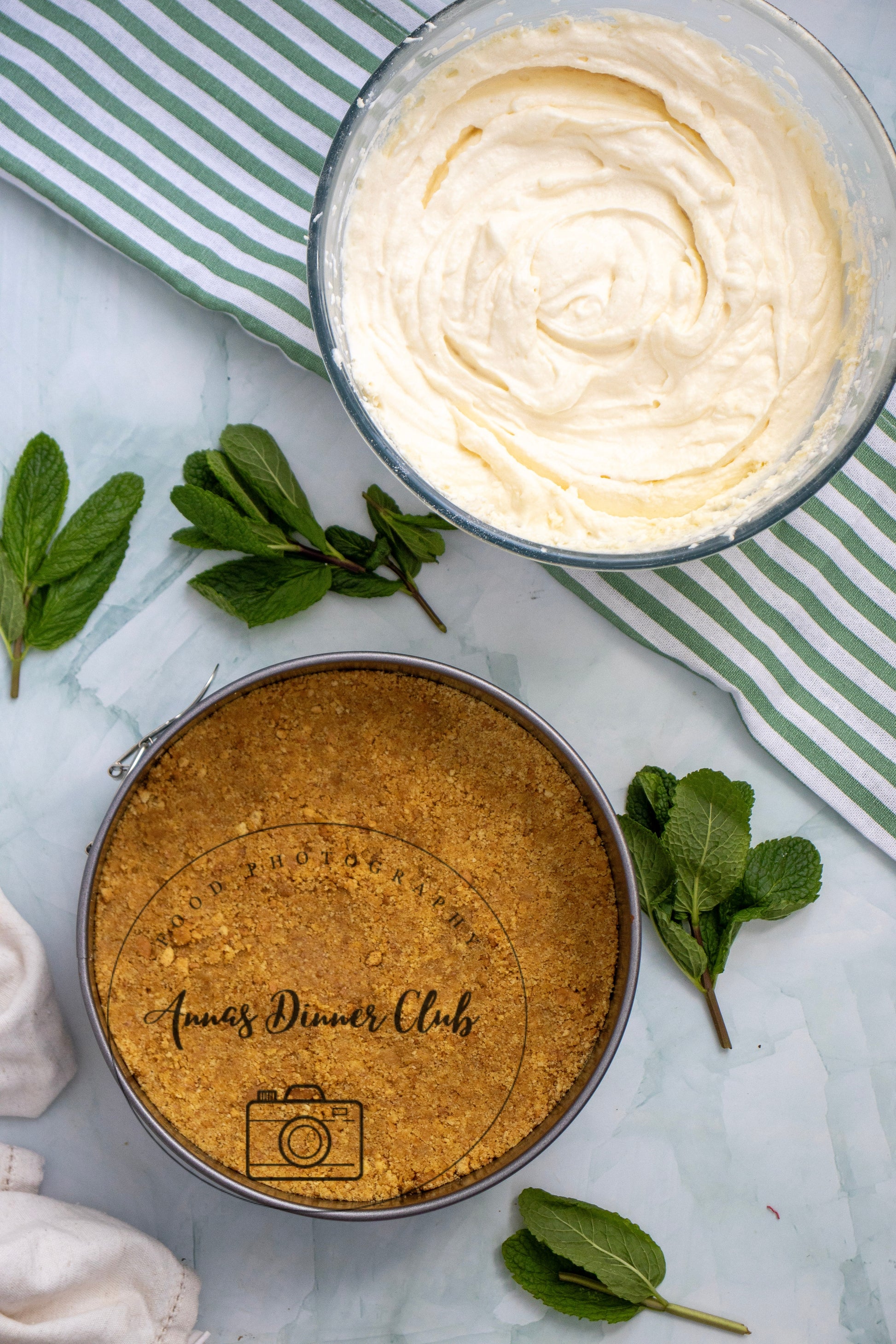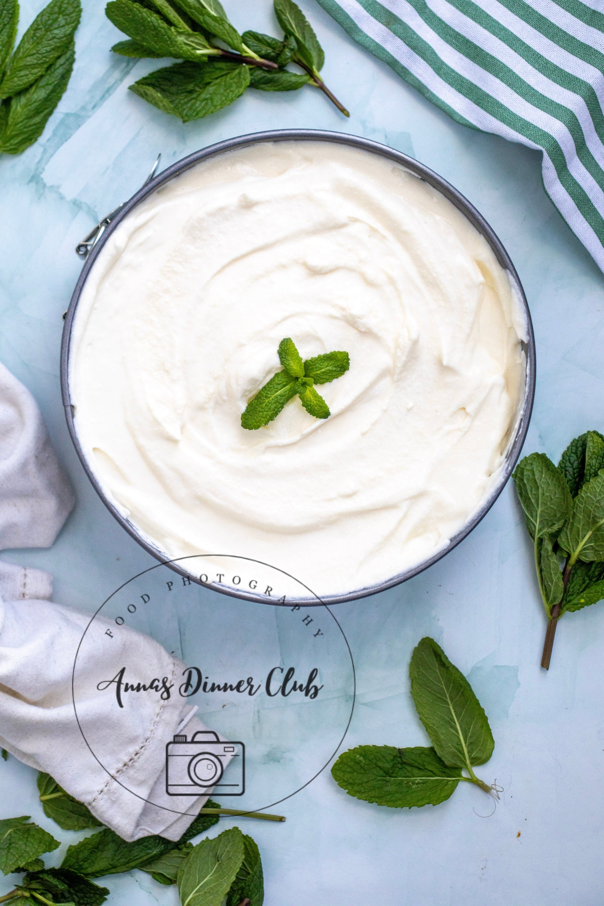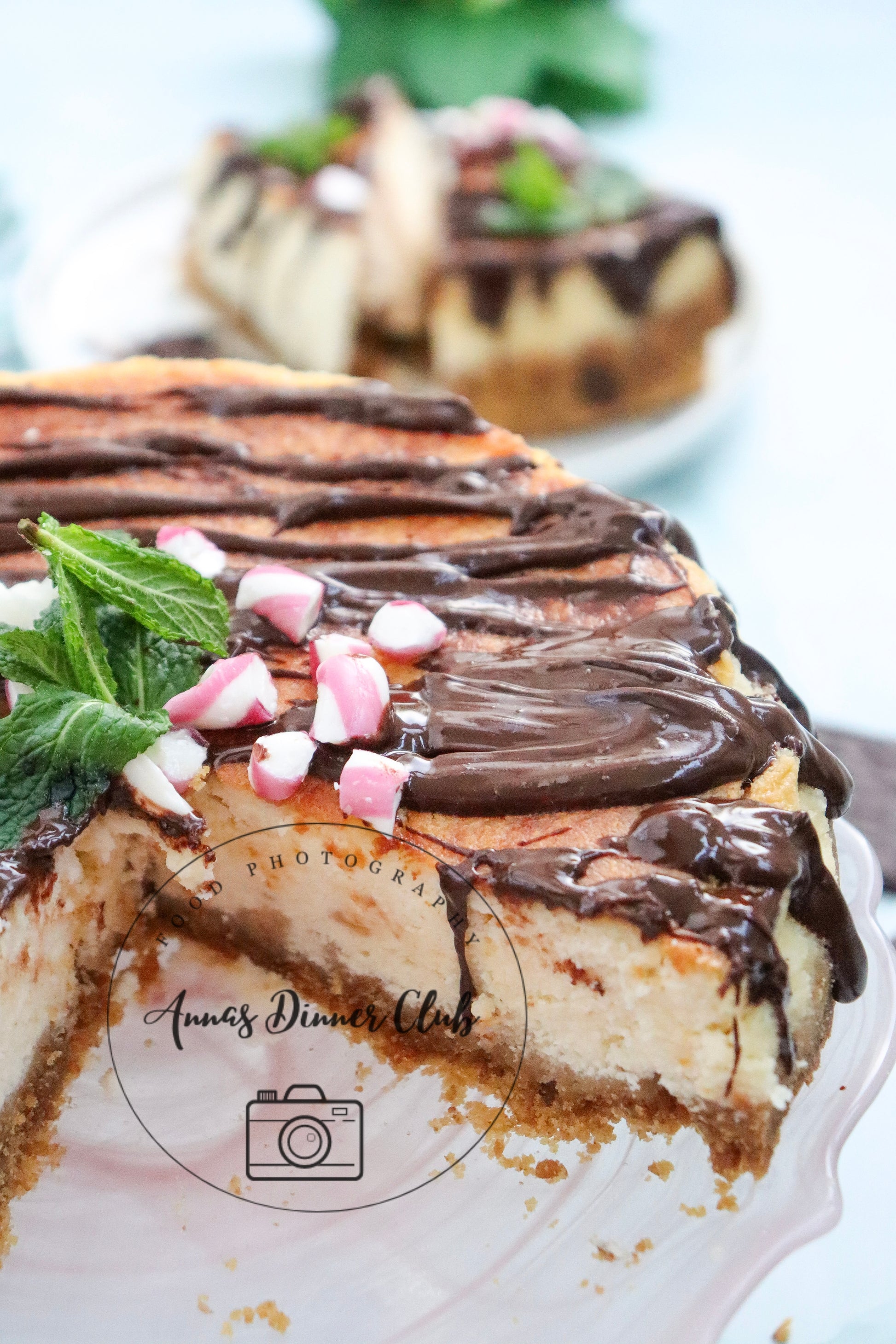 Ingredients: graham cracker crumbs, butter, cream cheese, vanilla extract, eggs, sour cream, peppermint extract, dark chocolate, granulated sugar, mint leaves and peppermint candies ( optional)