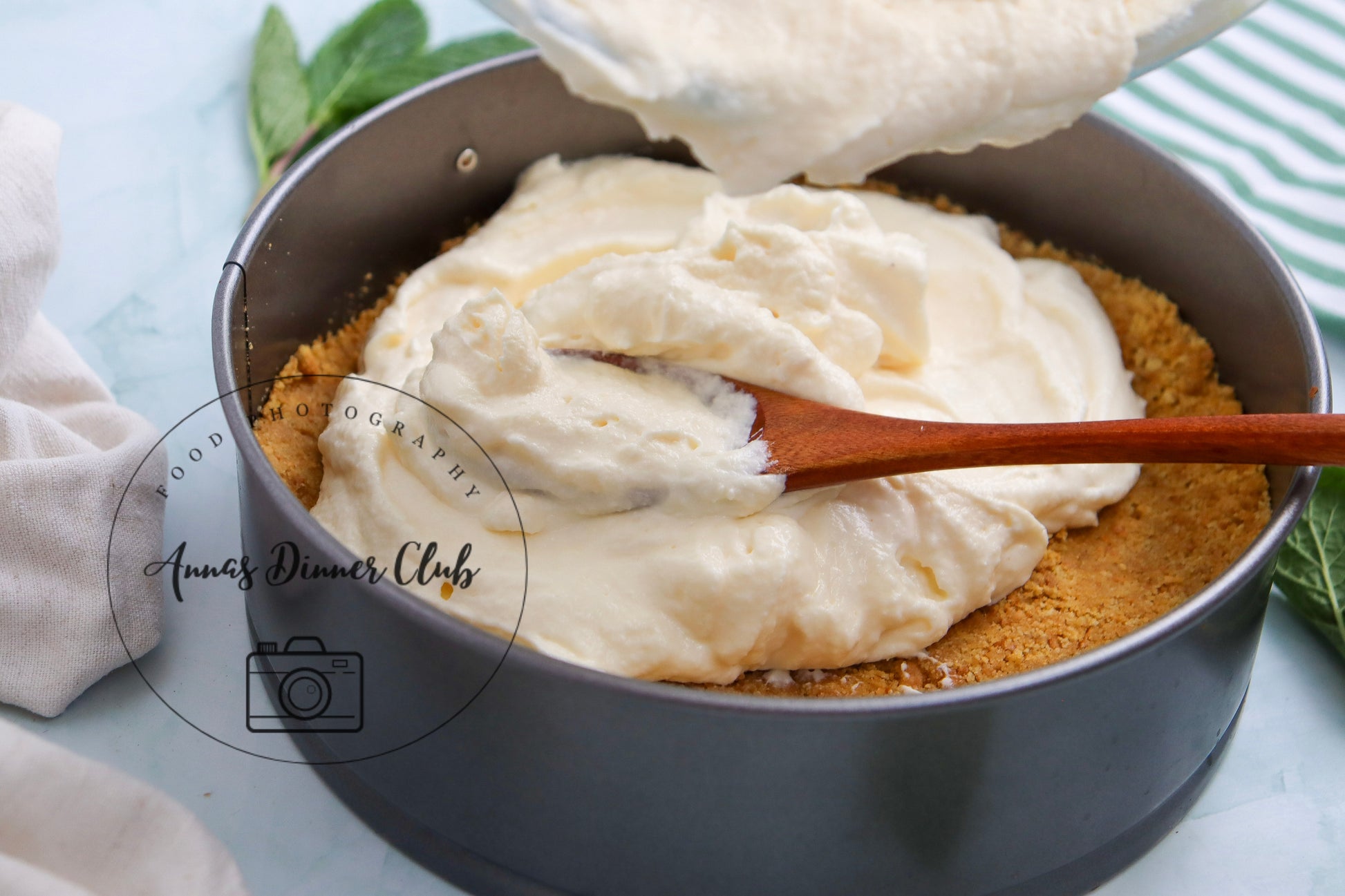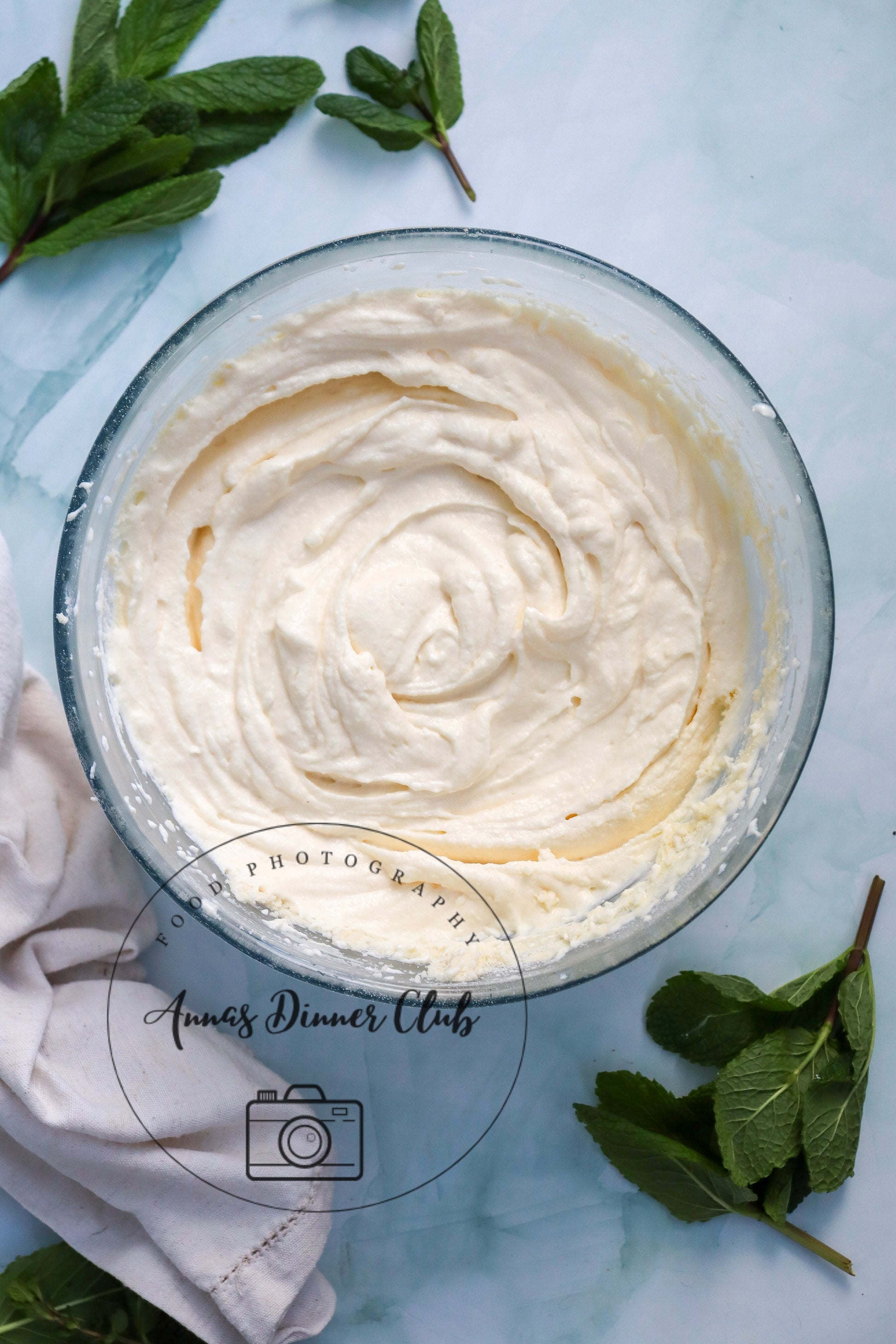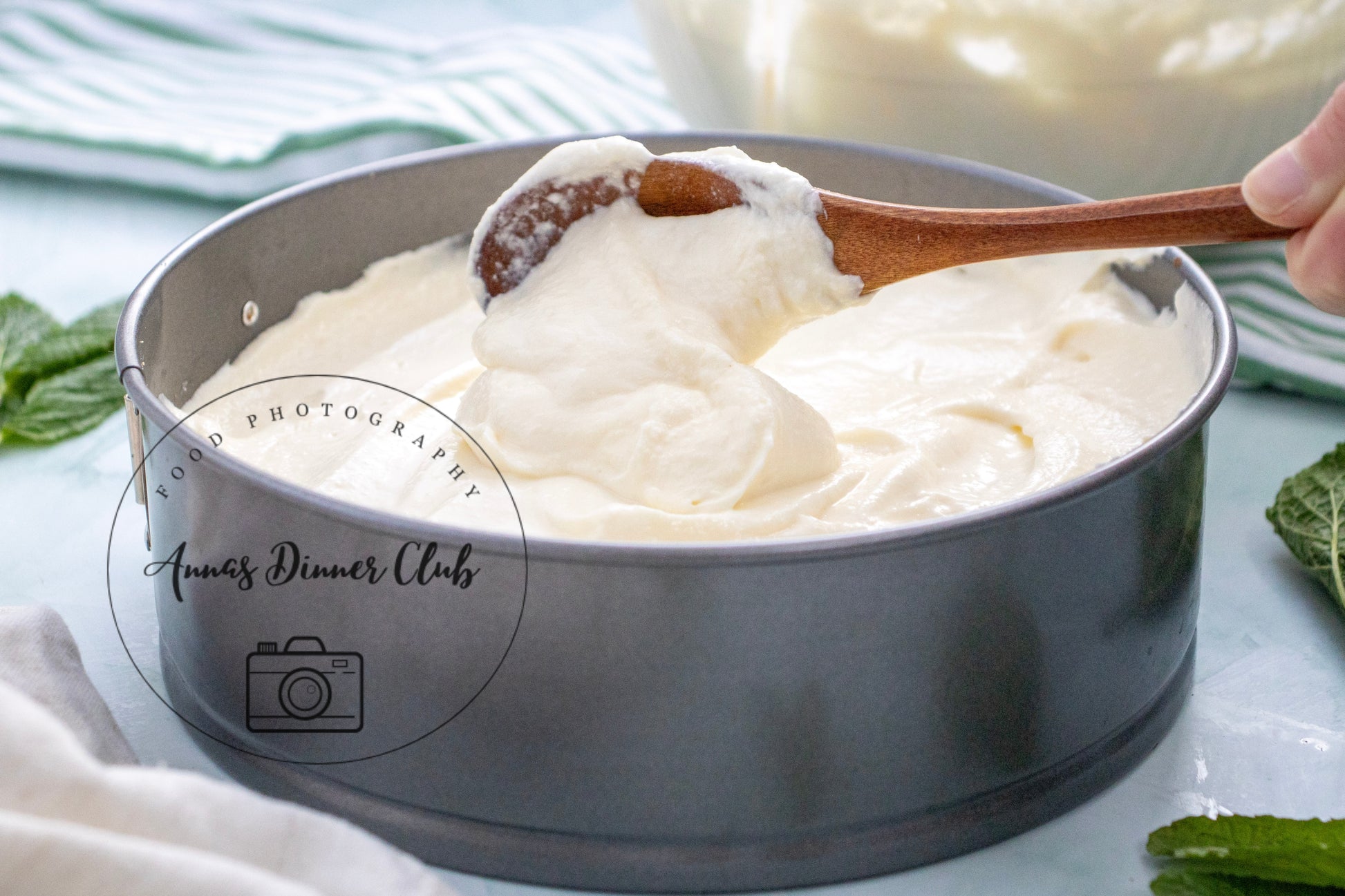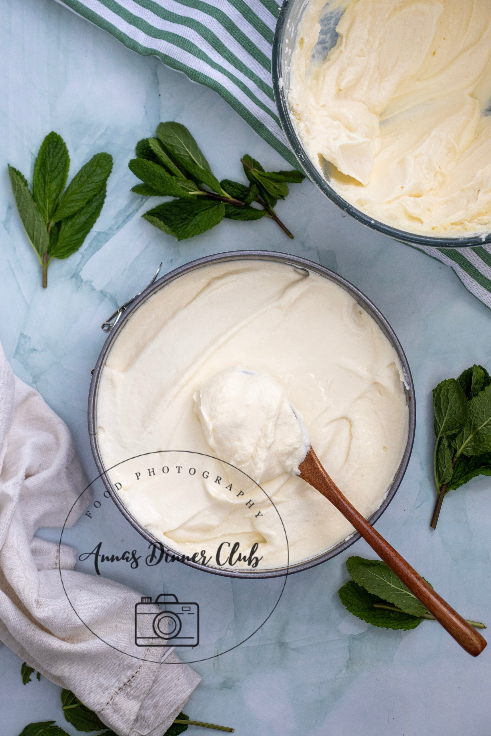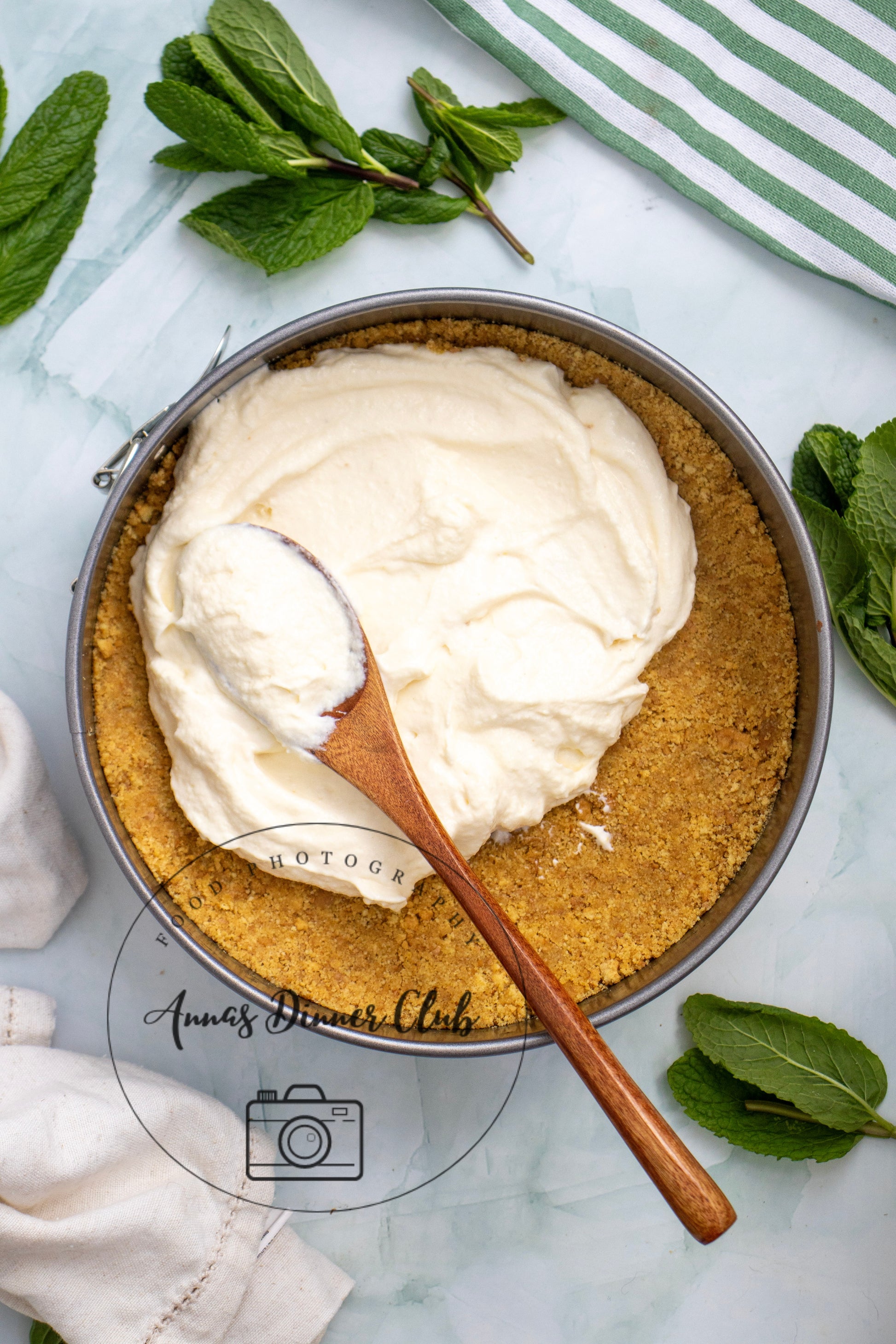 Ingredients: graham cracker crumbs, butter, cream cheese, vanilla extract, eggs, sour cream, peppermint extract, dark chocolate, granulated sugar, mint leaves and peppermint candies ( optional)