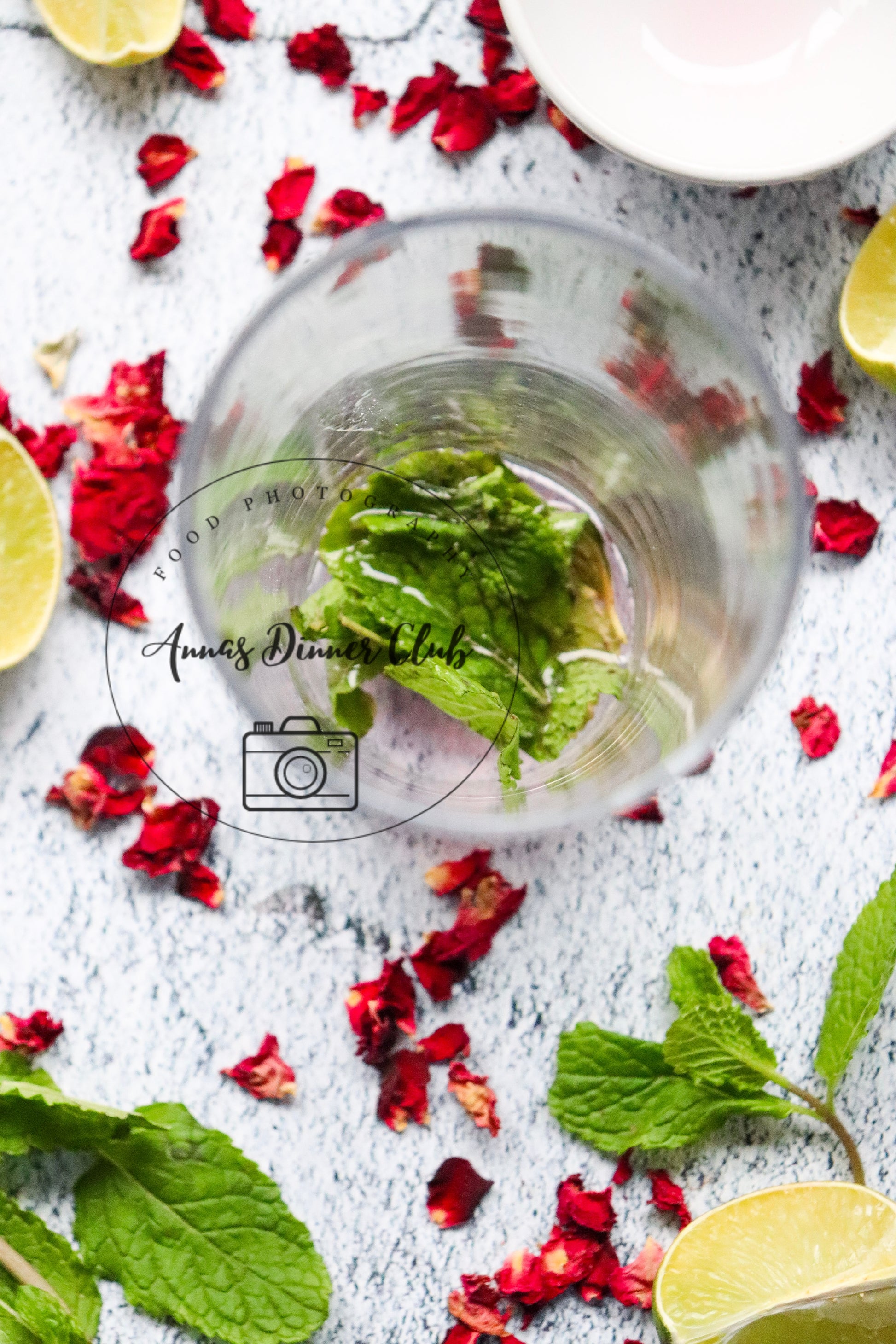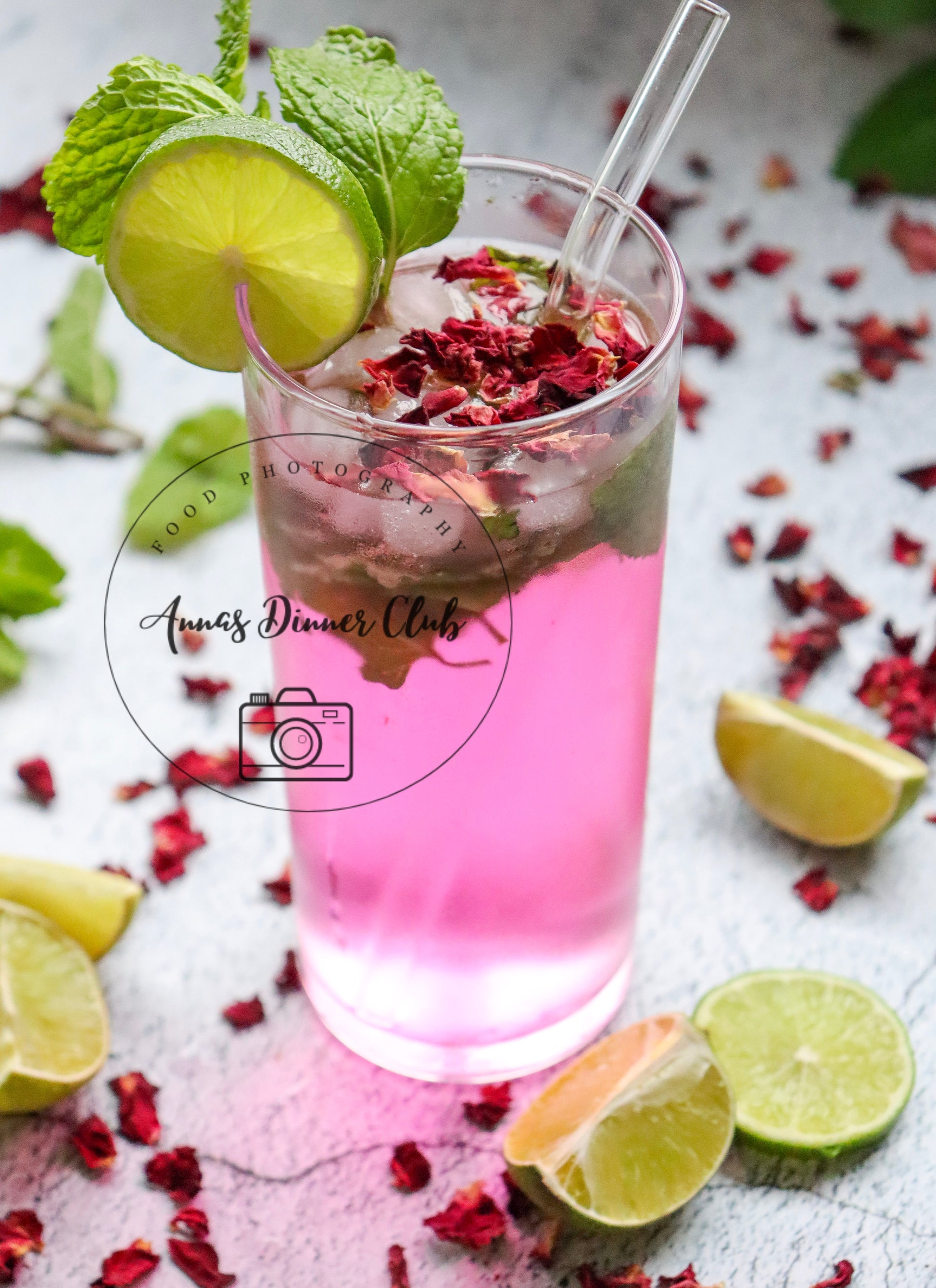 Ingredients: mint leaves, rose syrup, edible rose petals, club soda or sparkling water, lime